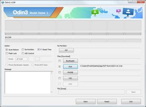 Una vez tengamos los archivos preparados solo tenemos que apagar nuestro dispositivo y cerrar Samsung KIES, en el caso de que estuviera abierto en nuestro ordenador. Abrimos ODIN haciendo doble clic en el archivo .exe y una vez abierto pulsamos "Reset". En la casilla PDA añadimos el archivo CF-Root. La ventana de ODIN tiene que ser así: